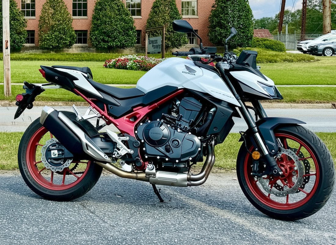 But the Honda CB750, at least in this color scheme, wins the beauty pageant in our humble opinion. The “Matte Pearl White”, with its black accents and that Marilyn Monroe-lipstick red frame, just knocks us out. Geez, that’s a sexy color. They sell a “Matte Black Metallic” Hornet for the same price, but we’d take the Marilyn Monroe, all day. We even imagined a Honda accessory rims offering, color matched to that frame. Phil mocked one up in Photoshop, and we just had to share it here.