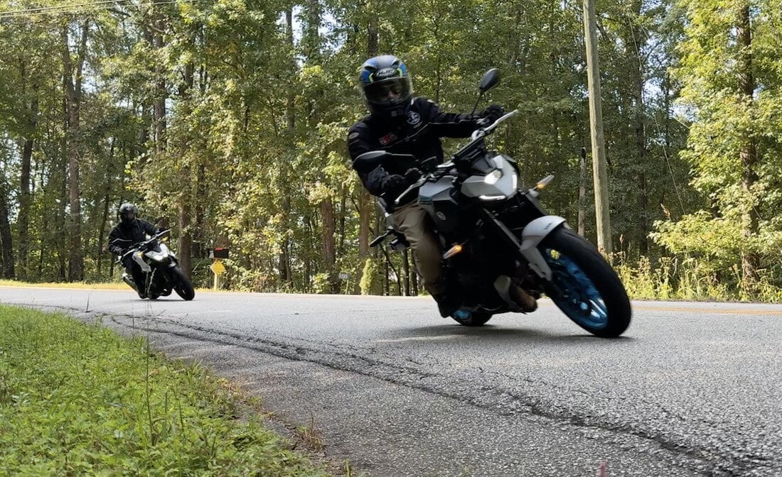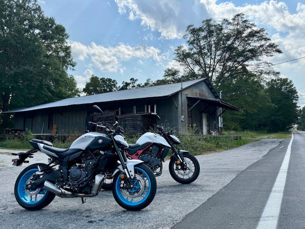 Curve carving nose-to-tail, MT-07 followed by CB750, outside Monroe, Georgia. This is where both bikes shine.