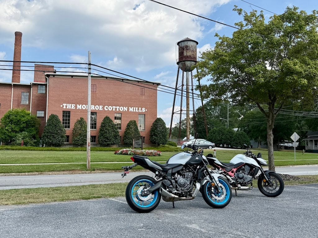 When you compare the bikes head-to-head and nose-to-tail like Drew and I did for a day, the differences between the bikes’ performance specs become more evident. The Hornet sports 66cc over the MT-07, makes about 5 more ft. lbs. of torque and 11 more hp, yet weighs in 19 lbs. more than the Yamaha as well. Those aren’t huge differences, obviously, but chasing each other around north central Georgia and swapping bikes all day, we both noticed those subtle differences. Drew noted, “The MT-07 is punchy, but out on the highway stints we did, the Hornet packed a little more punch.”