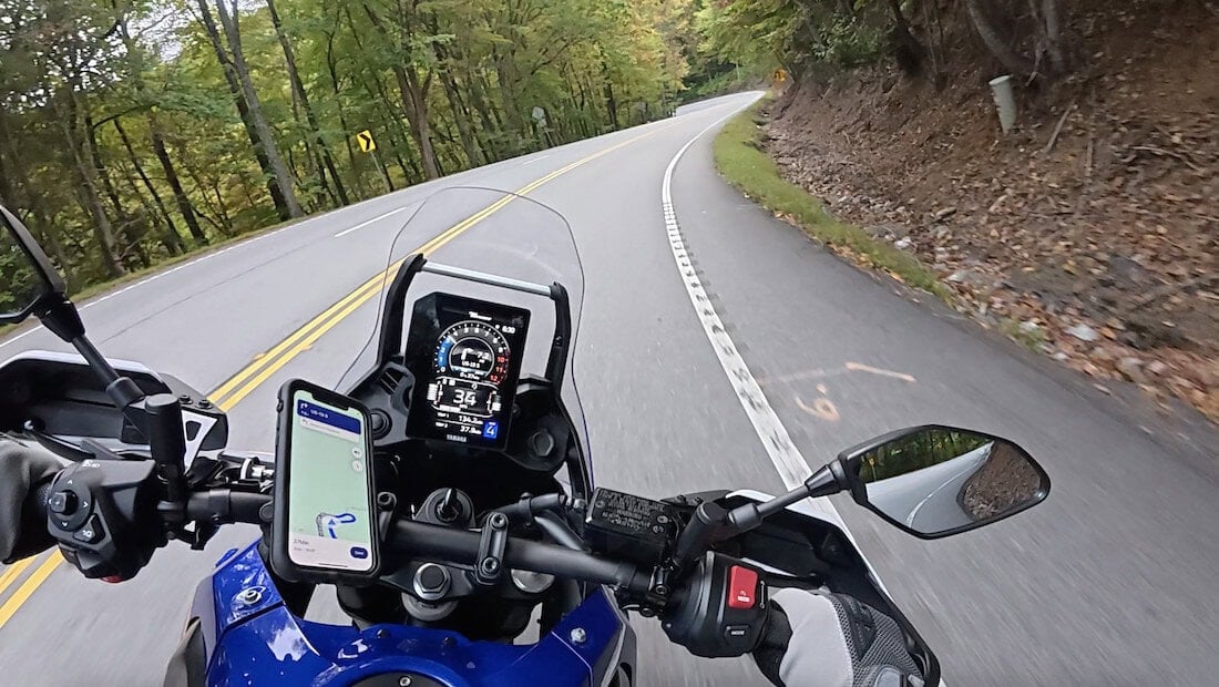 Feeling froggy in the foothills. The T7 handles tight twistys with ease. Notice the hairpin I’m about to lean into on my GPS.