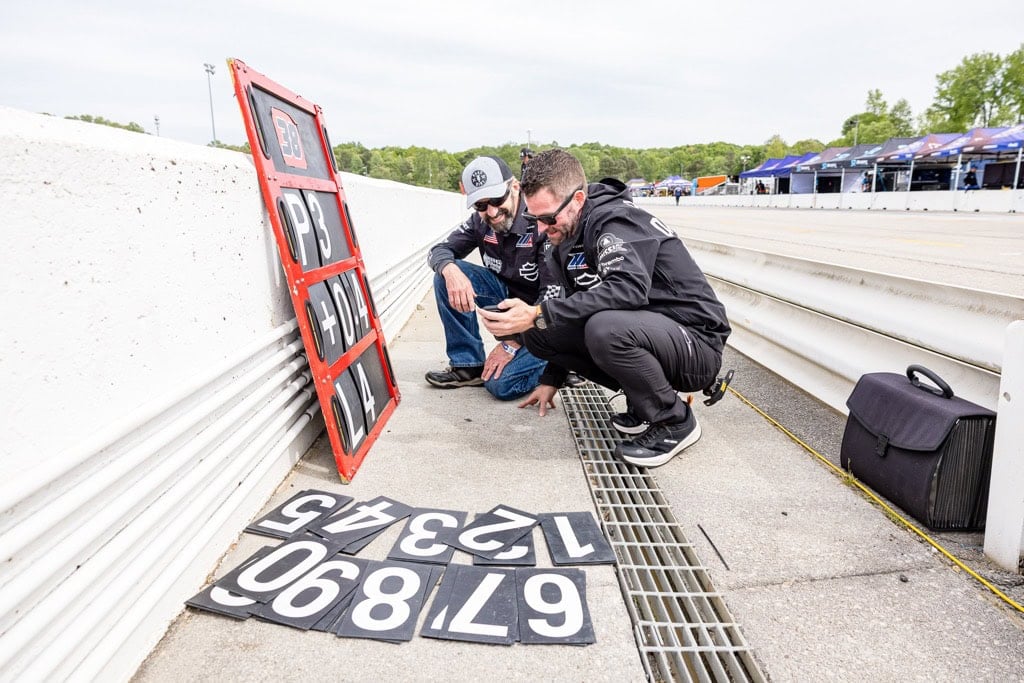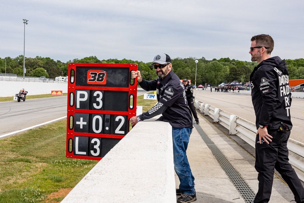 MotoAmerica provides race teams with two websites for lap-by-lap data collection, showing each rider’s speed, lap time, position, and gaps to other riders, all in real time. The bikes are equipped with transponders, whose signals are captured by the websites, then logged into and tracked by the race teams. “My view of the race is always from crouched behind the wall,” Carl quips, “reading the site data, then transferring it to the pit board for the rider as he goes by.” So I join him, crouching and transferring the digits Carl hands me to Bradley’s pit board, then hanging it over the wall as bike and rider thunder by.