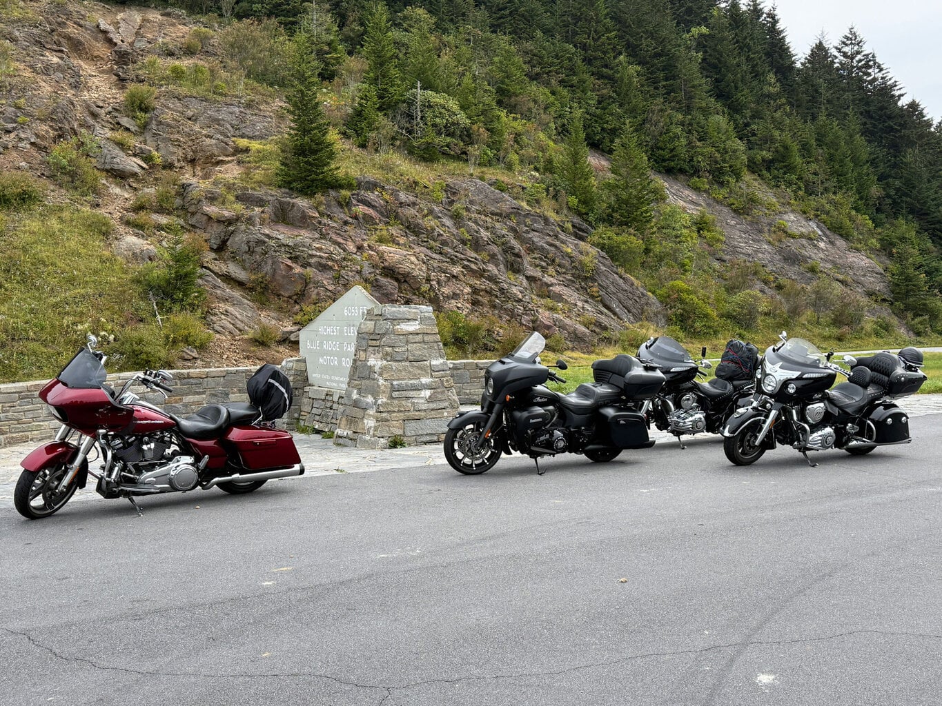 As we rolled into Asheville, we couldn’t help but notice the scars left from the 2024 floods. Streets still under repair, construction crews working hard, but also signs of recovery everywhere. From there, we hooked south on Hwy 25, then peeled onto the Blue Ridge Parkway with a unanimous decision to ride it all the way west to Cherokee.