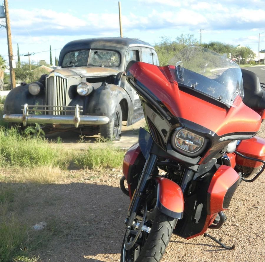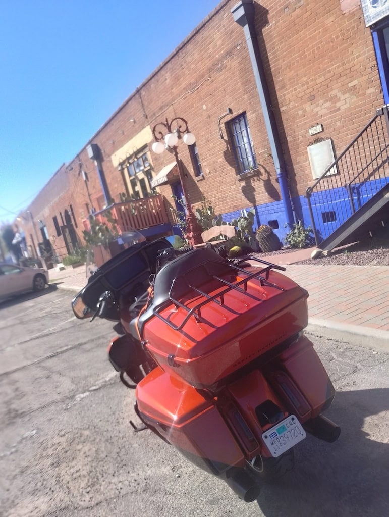 In my recent expedition to Tombstone for Helldorado Days, a ride up the mountain to Bisbee was on the menu. It was there, parking on a mild enough looking paved incline, that for the first time in some might say my aged motorcycling life, I was stuck. Embarrassingly, absurdly, stupidly stuck. I couldn’t get the kickstand off the ground no matter how hard I cursed at the thing. I couldn’t start the bike and ride off the stand because the Ultra doesn’t like that. It stalls. Jesus, Mary and Joseph, was I ready for assisted riding? After many years in the gym, I concluded this was not my fault, except for the parking in a dumb spot part.