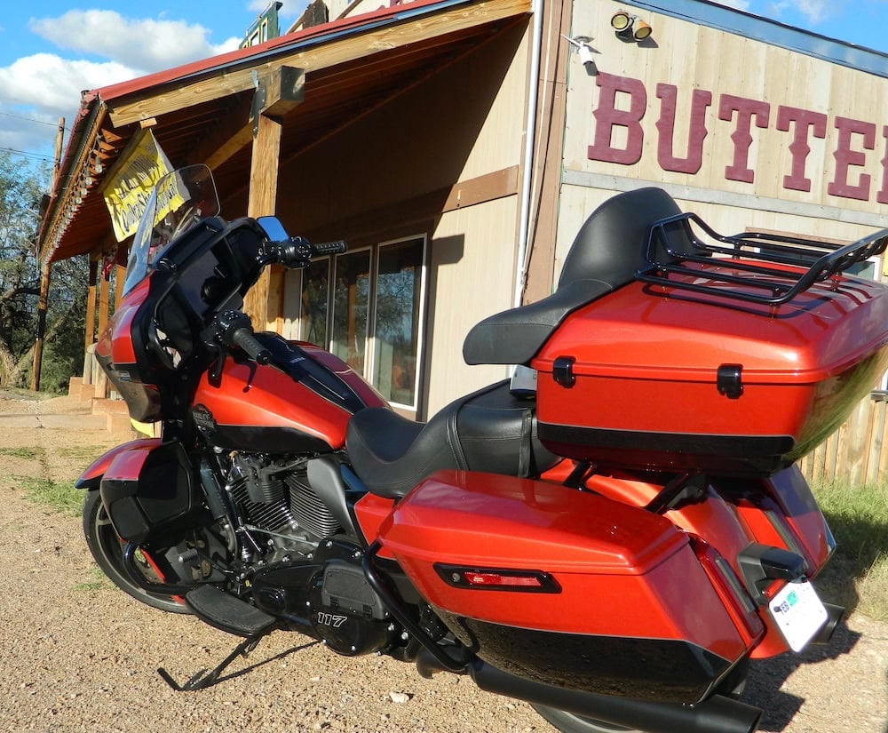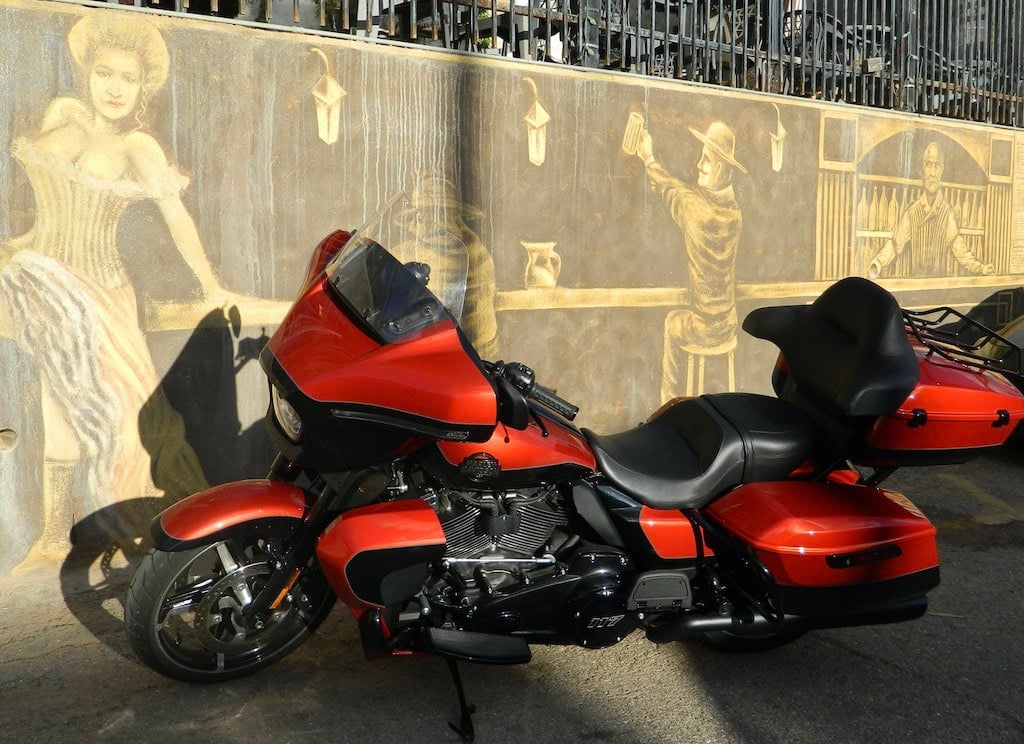 The Ultra is like a missile, built for speed but with plush accommodations. It’s when things slow way down that control becomes more of a deliberate and precise effort. The Street Glide Ultra weighs 866 lbs wet, according to the specs, but it feels heavier at parking lot speeds and tight maneuvers. If you make the mistake of parking it on a slope kickstand side downhill, then muscling it back up can get interesting. And if you’re in a mining town, say like Bisbee, AZ, which are almost invariably slopey, then you can really be in for some fun. And if that slope happens to be on dirt or gravel, it’s time to call your momma for help.