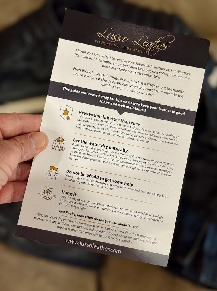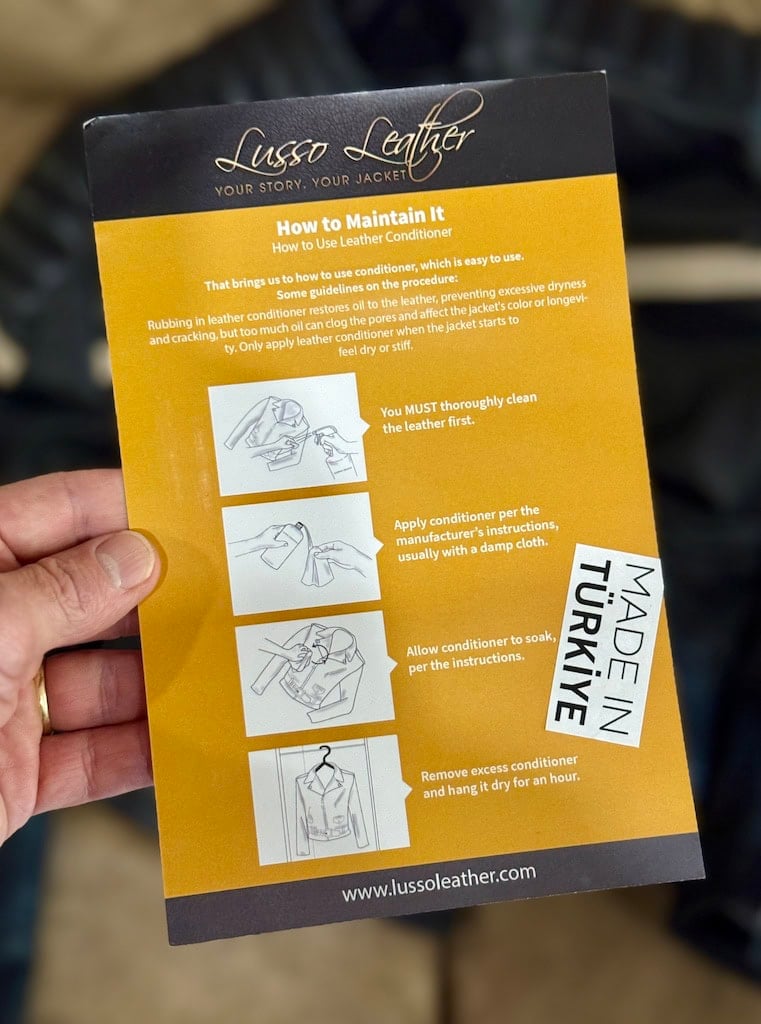 Lusso sends along a “Care & Maintenance” card for keeping the jacket in pristine condition, which I appreciate. I can’t find any Lusso brand leather cleaner or conditioner for sale on their site, but they give a nice step-by-step in cleaning and conditioning the jacket. If anyone has recommendations on good leather cleaning and maintenance products, drop them in the comments section below.