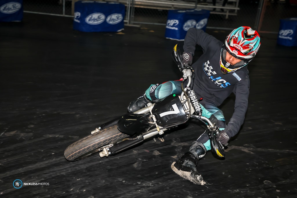 Grace Pavilion has a coating over concrete that makes it perfect for use as an indoor short track. Stephan Nielsen of Neilsen Racing set up the track again this year. In order for the riders to get the most speed and keep the slide going, many modified their riding boots in a special way.