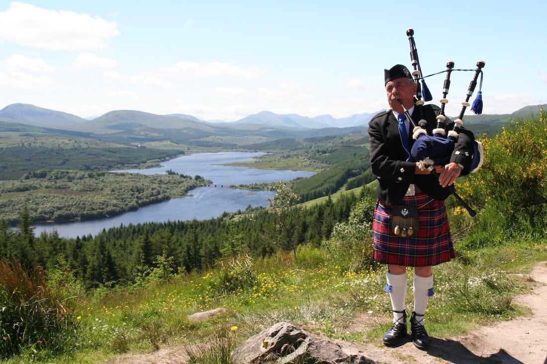 The quintessential Scottish bagpiper, in his element.