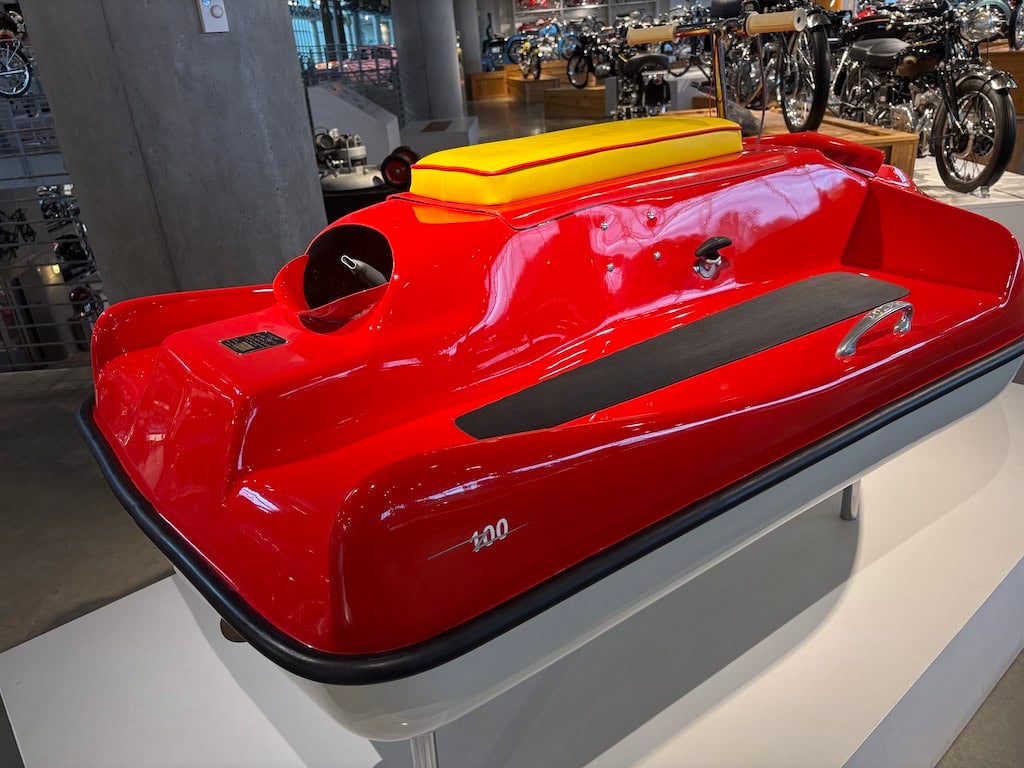 The Amanda Water Scooter, also at Barber Vintage Motorsports Museum, powered by a small Vincent 100cc single. Note the engine casing in photo 2, and the pull start & exhaust in photo 3. The Amanda made 2.1 hp, topping out about 15 mph. Photos by Joe Avila/Barber Vintage Motorsports Museum.