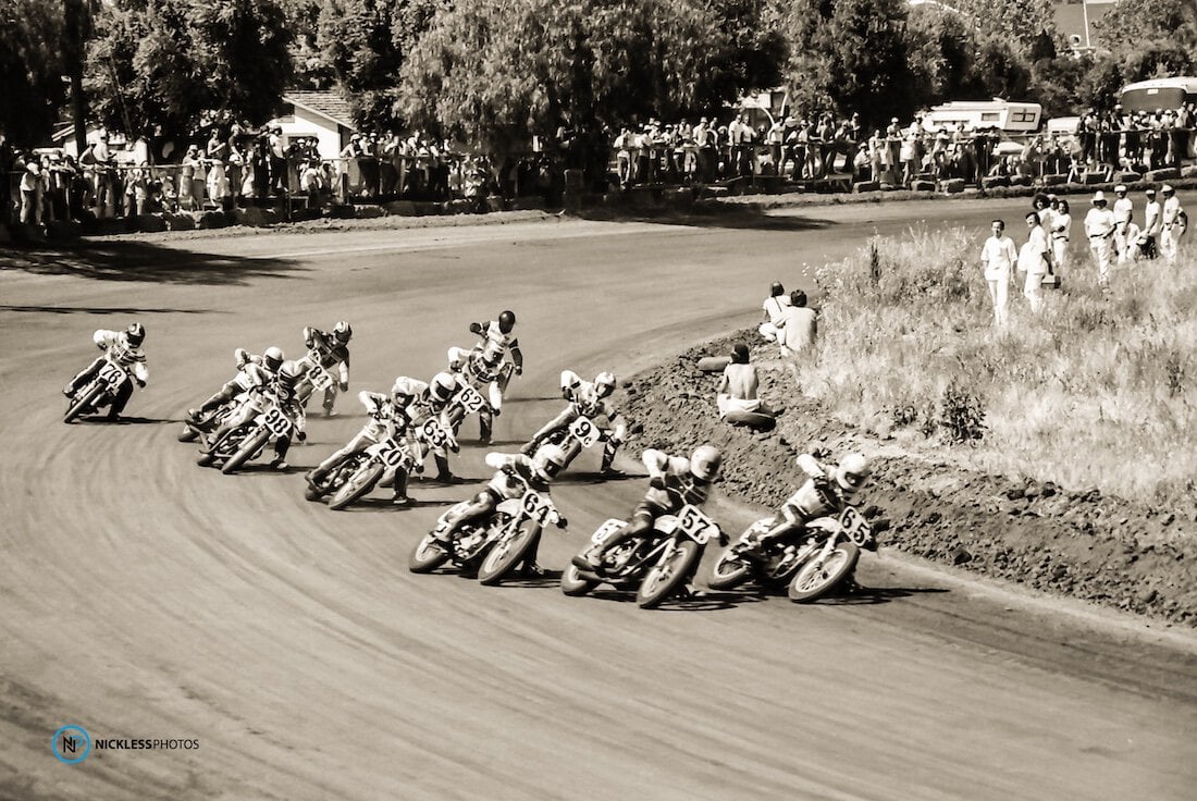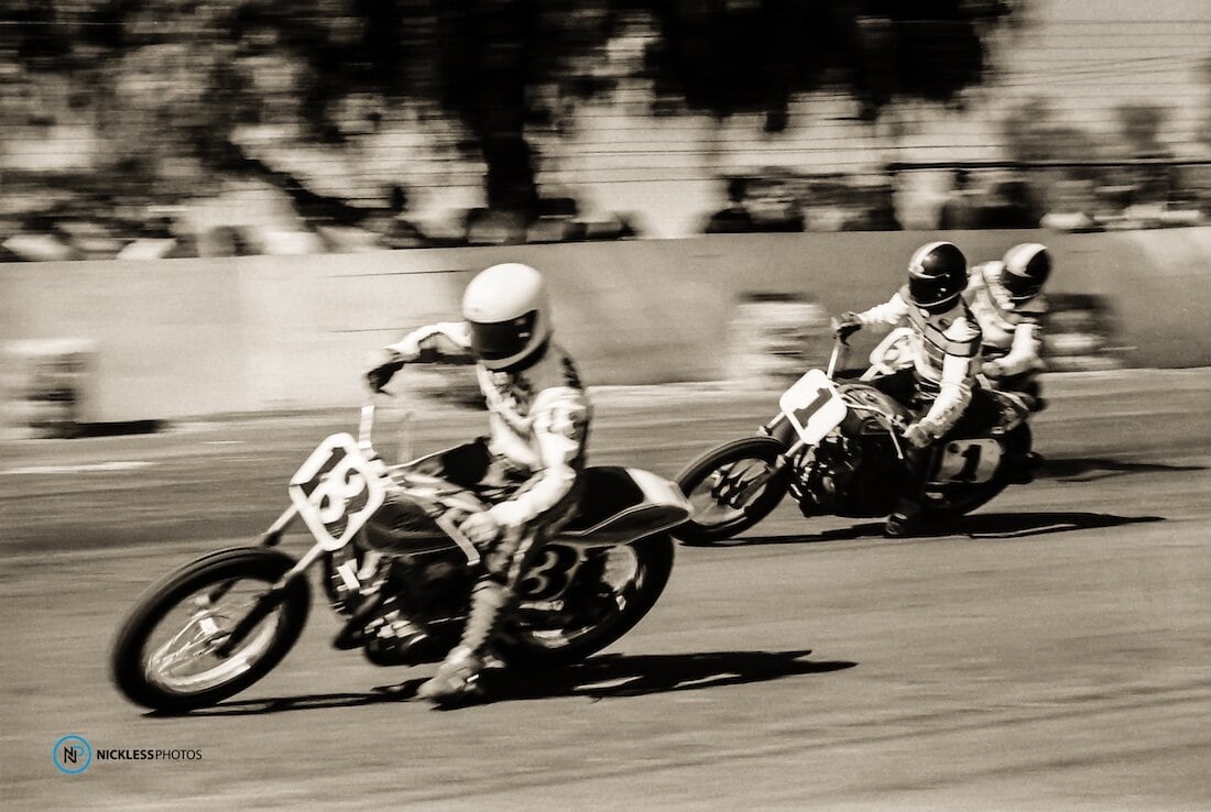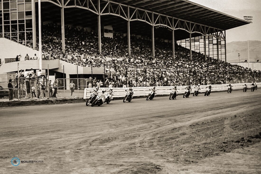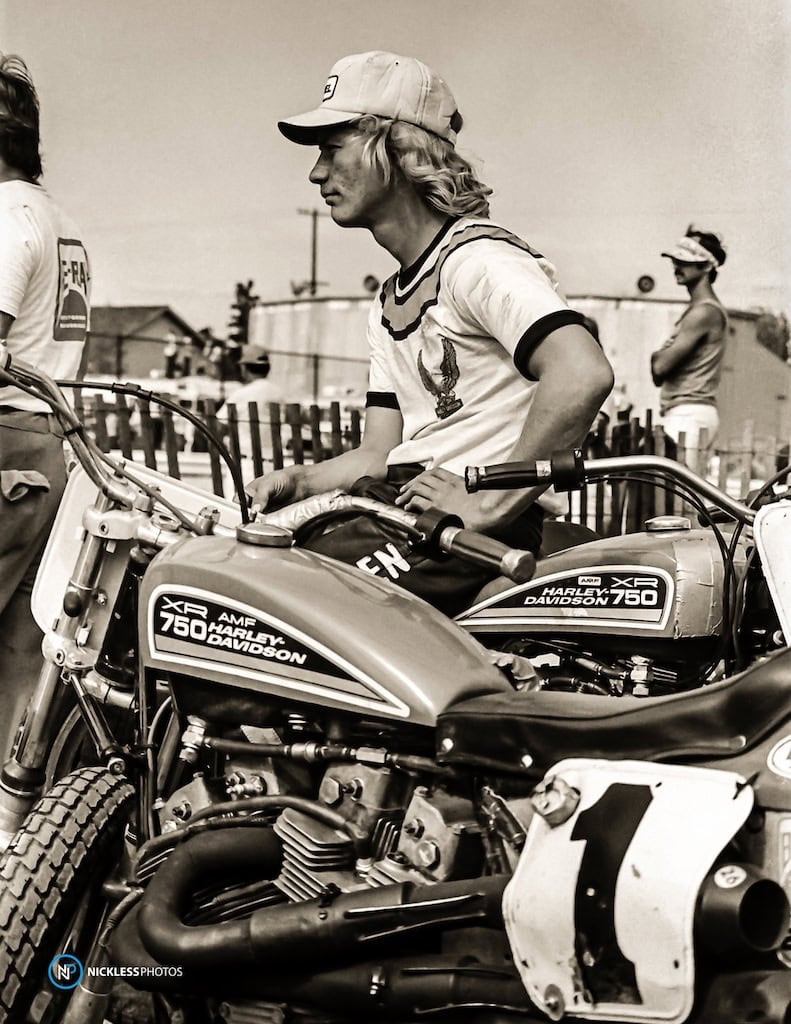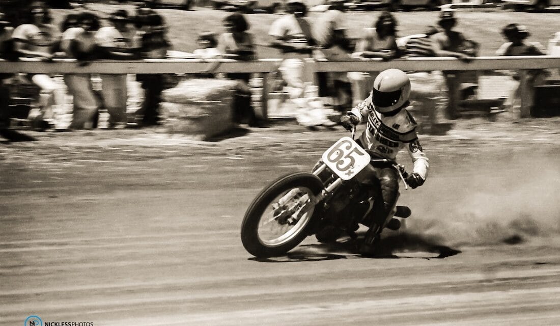 Jay “Springer” Springsteen is a Michigan legend, whose racing and AMA 1975 Rookie of the Year status put him on the radar in Flat Track racing. While at this year’s annual Hot Shoe Hall of Fame inductee event in Las Vegas, Geoff tracked down Jay to give him a print photo he had taken of him in 1977 at the San Jose Mile: