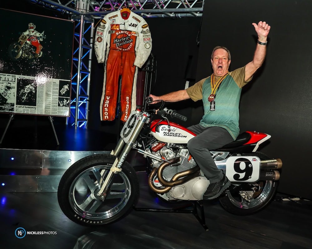 Jay is a colorful character and loves to bench race with fans and other legends. While up on stage in the Hot Shoe Hall of Fame interview with Terry “Ike” Clanton, Jay quipped, “Me and Corky made Kenny Roberts famous at the 1975 Indy Mile!” His reference was to the fact that Kenny caught them on his Champion framed, Kel Carruthers tuned, TZ750 Miler on the exit of Turn 4 onto the front straight on the last lap, and won by a wheel length. While talking with Jay, he shared that Dick O’Brian, Harley-Davidson team manager, thought that Corky and Jay were just playing around, going back and forth. Jay replied, “I kept pointing behind me, trying to tell Corky that the number #1 was coming up because I took a look back! Corky must have thought I was calling it until Kenny screamed past us both.”